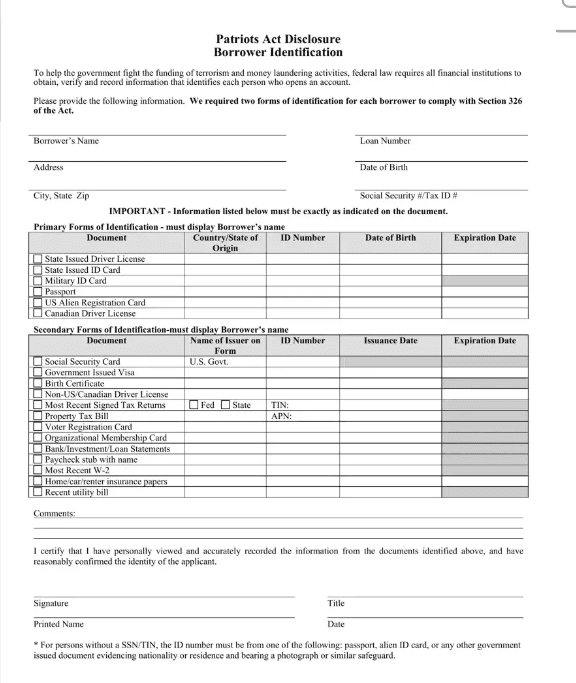 I want to take this a step further by tying this conversation to a document many people have seen—but may not fully understand—the Patriot Act Borrower Identification Form.